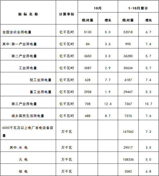 1-10月份,全國全社會用電量52018億千瓦時,同比增長6.7%。10月份,全國全社會用電量5130億千瓦時,同比增長5.0%。